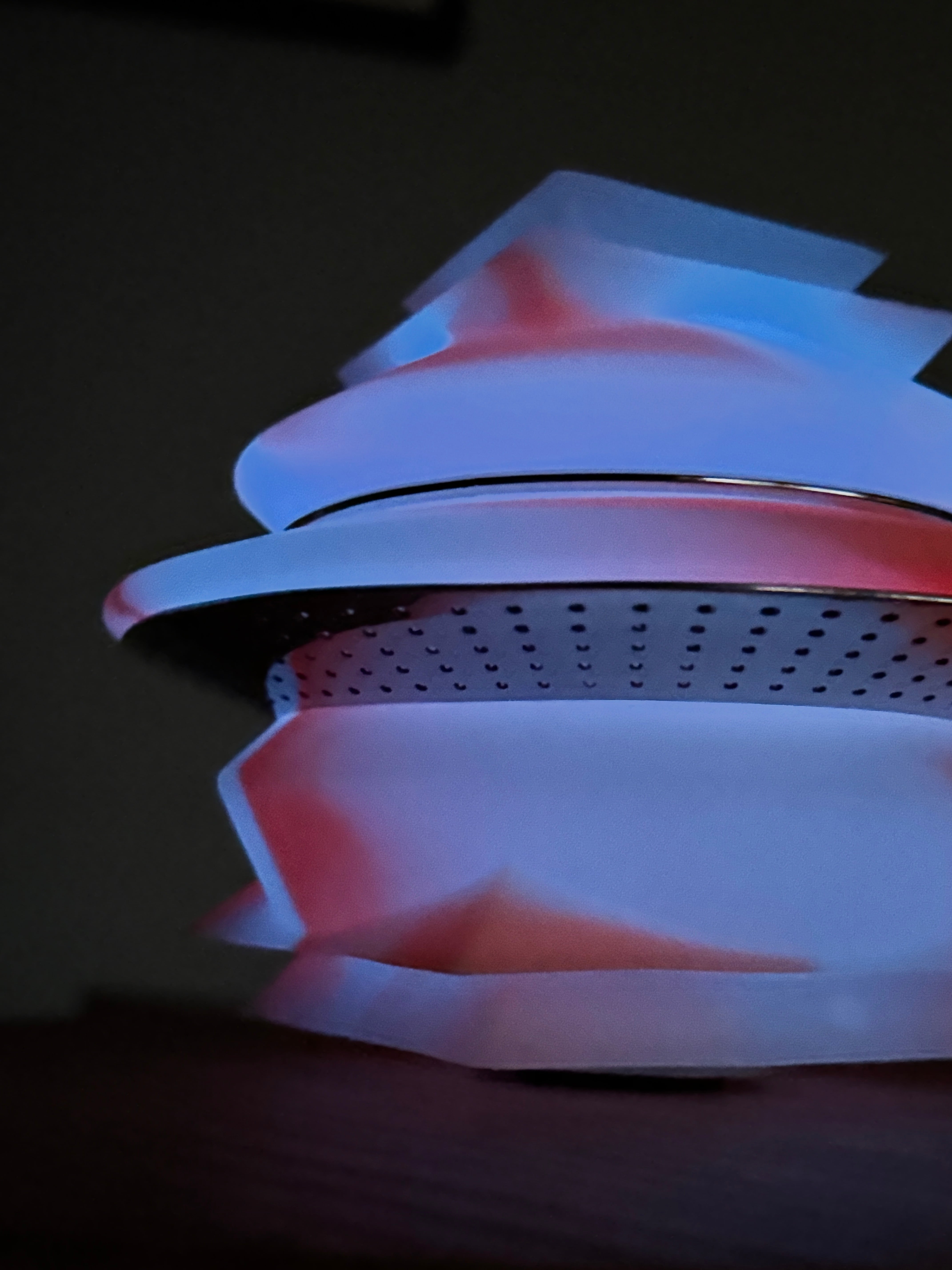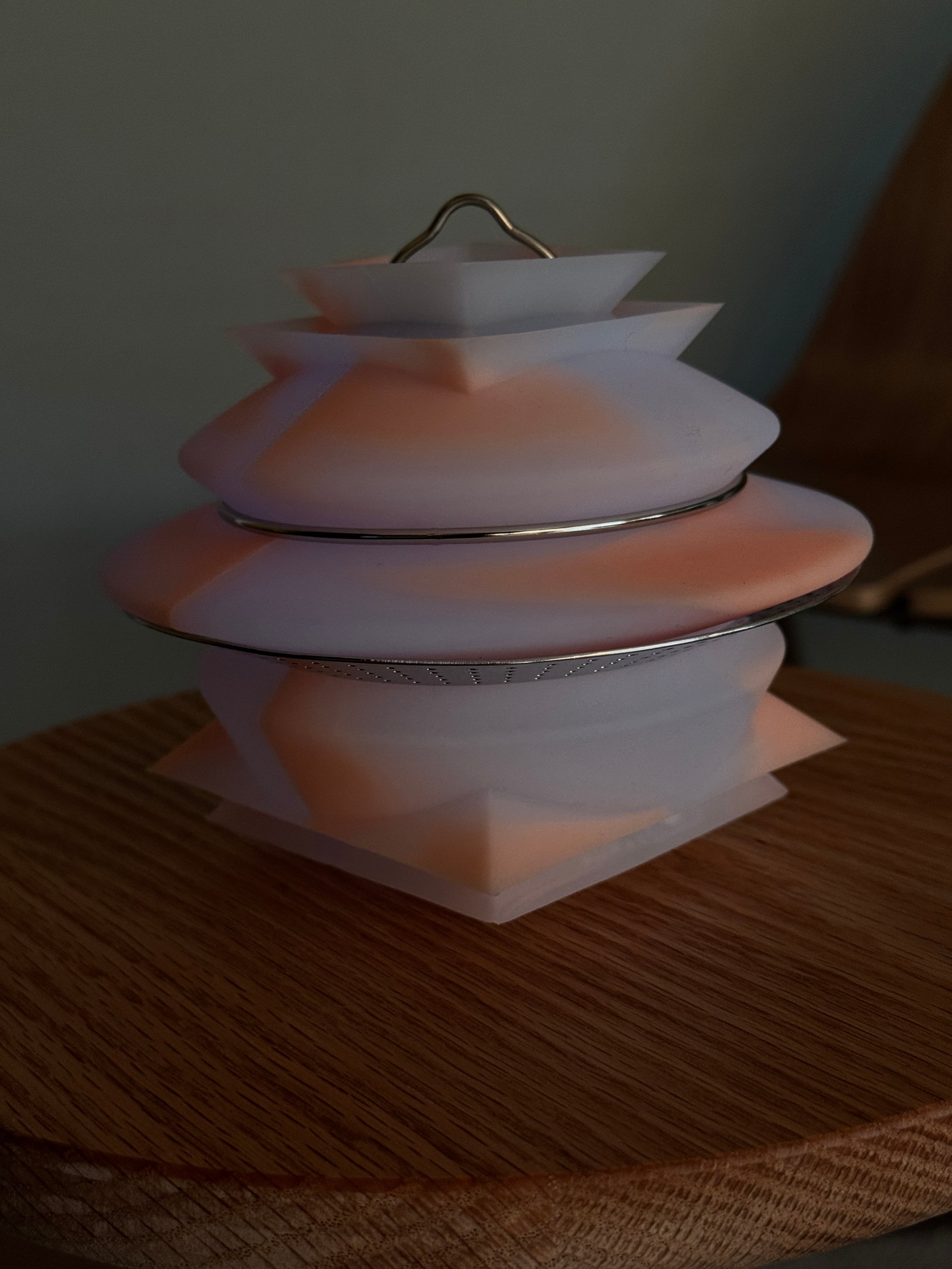 シェード本体に淡い赤色とウォームホワイトの様な美しいマーブルで本体を彩り点灯すると夕焼け雲を思わせる優しい演出。また消灯時には赤色と青色の蓄光効果により幻想的な演出をしてくれます。更に外部のステンレスに反射した灯りが美しさを表現。