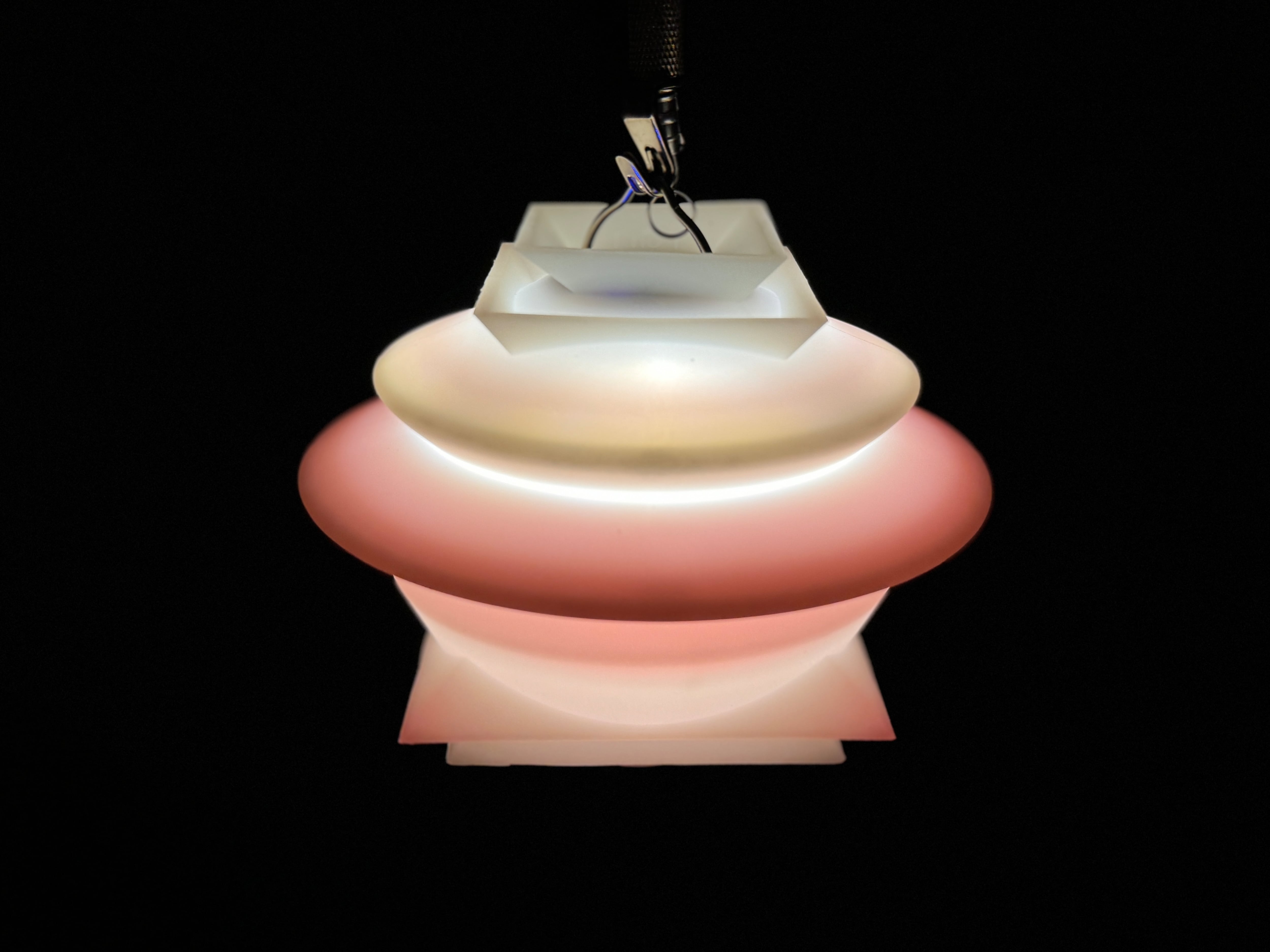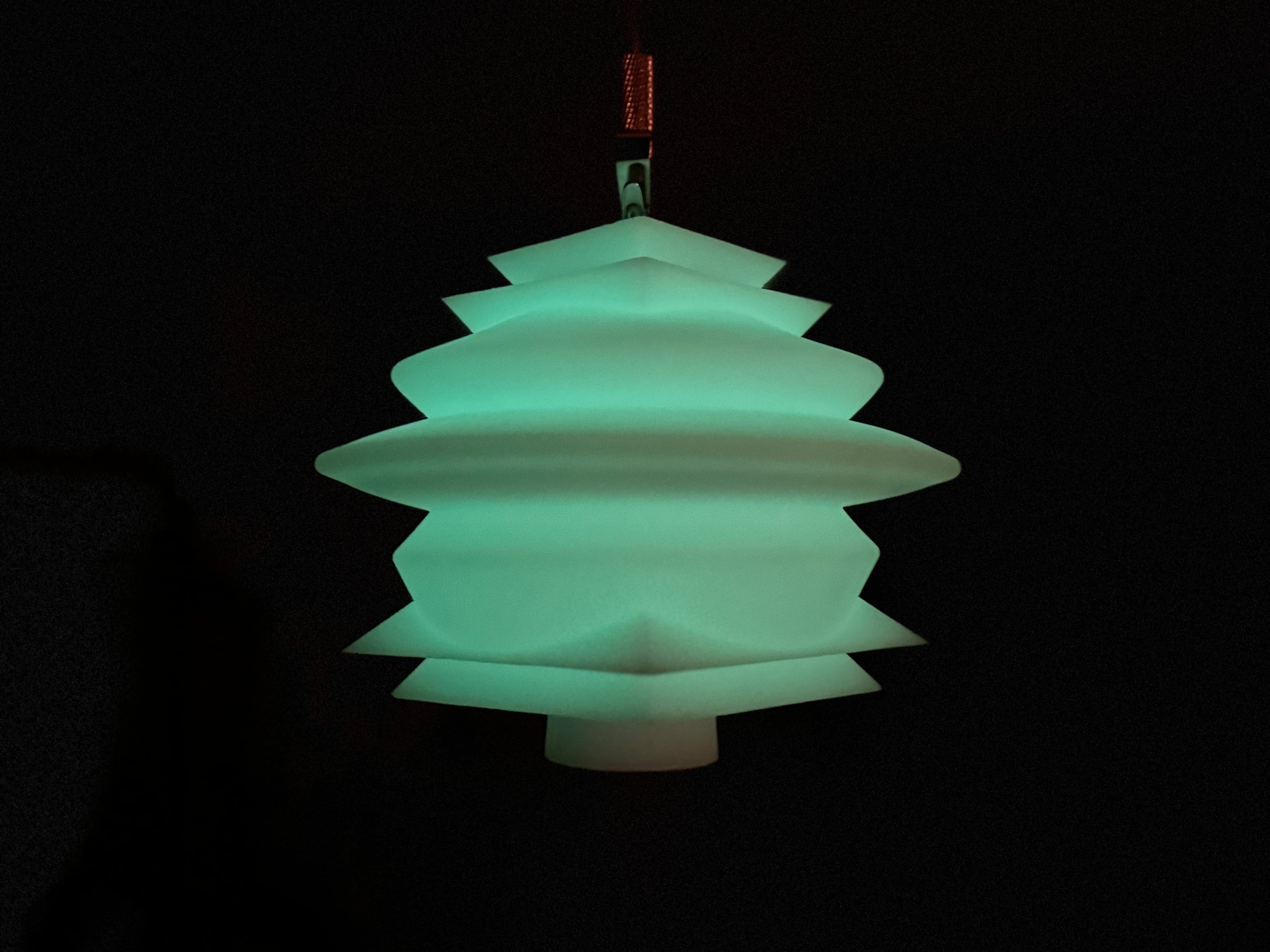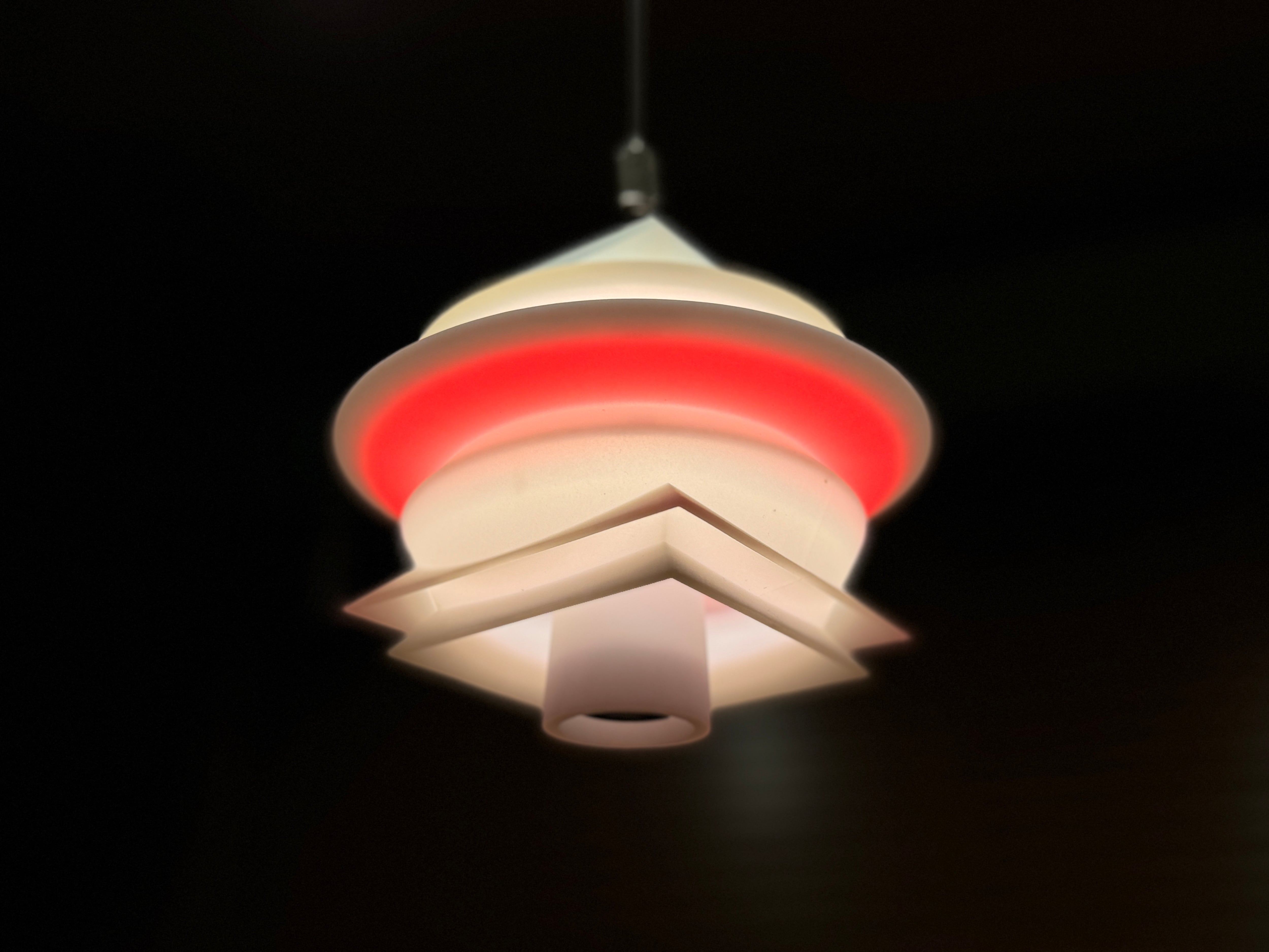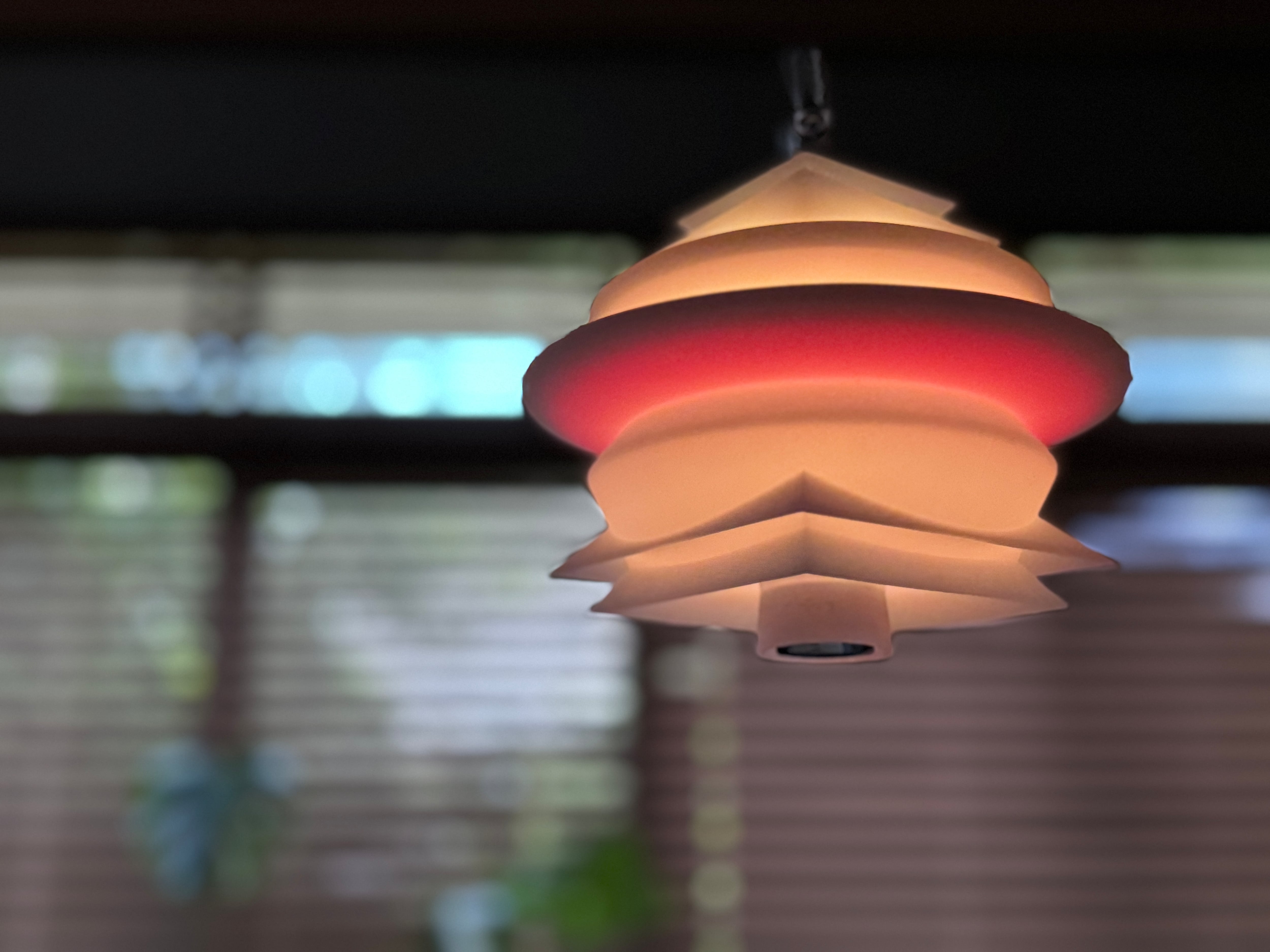 シェード本体に赤く美しいグラデーションが演出され空間創りのアクセントにもなり、消灯時には蓄光が緑色の儚い光量でサポート致します。